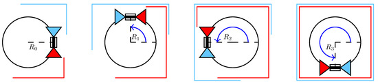 Perception redundancy after a full carrier rotation. The triangles in blue and red show the LiDAR’s frustums in a simplified manner. The lines, also in blue and red, are the measurement in the respective view direction. The figure shows four representative carrier orientations with the revolving LiDAR and how its perceptions construct a full scan after a 180° carrier rotation.
