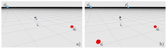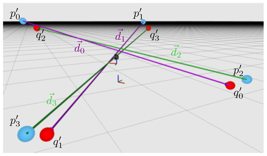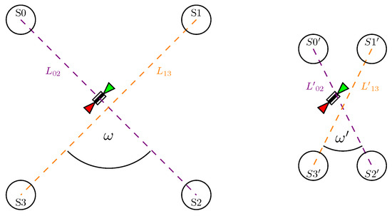 This leads to another observation of two such vectors and between the same pair of spheres, but seen with different carrier orientations and , respectively, resulting in and as illustrated in Figure 4. Due to the redundancy in the LiDAR’s measurements, both vectors have to point in exactly opposite directions, when they are transformed into a common frame. This is because both measurements include the same spheres: on the left of the sensor and and from the other orientation. This means that