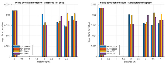 The plots in Figure 7 indicate an improvement of the extrinsic parameters compared to the respective initial guess, as measured with the plane deviation. The tendency to the optimal configuration goes to a sweet spot at a distance between sensor and targets of and a high resolution for the grid search (blue and red bars). This is indicated by a very low plane deviation for these configurations. Other configurations with close targets or a low resolution of the search grid also improve the initial pose, but scored less, compared to the sweet spot.
