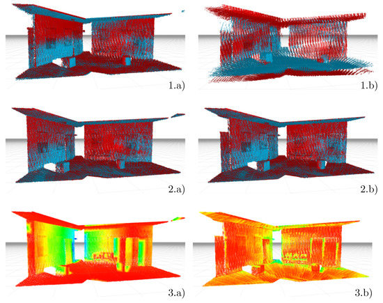 Point clouds sampling the excerpt of the test scene, the quality measure was applied to. The images (1.a,1.b) in the first row show the records done with the initial extrinsic parameter sets, used to study the influence of the initial pose the optimiser starts with. The cloud in (1.a) results from using the sensor pose parameters measured on the SWAP platform by hand. The one in (1.b) results from applying the transformation resulting from a deterioration of the measured transformation. Images (2.a,2.b) in the second row depict the resulting clouds after the parameter optimisation from the respective initial poses. The red and blue point colouring in the first two rows result from separating the two redundant measurements. The images (3.a,3.b) in the last row show the distances between the two clouds above. The intensity encodes the magnitude of changes with blue representing strong changes and reddish colors representing small changes.