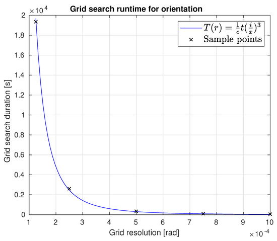 However, the complexity of the optimisation of the sensor orientation remains cubic. It can get tractable, in practice, by reducing the range of the search space or the parameter grid’s resolution. The latter, however, is also a problem because the exact global minimum will probably be missed with a low grid resolution. Therefore, this is tackled with a subsequent local optimisation using a gradient descent solver using promising candidates resulting from the grid search as starting points.