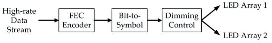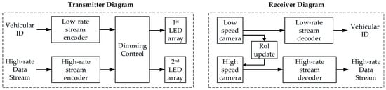 Figure 2 illustrates the architecture of region-of-interest (RoI) signaling. The transmission of RoI is beneficial when the camera Rx has the ability to capture the area in which the communication link should be set up. The light source Tx continuously notifies the camera Rx via a known signal for differentiating it from other unwanted light sources and other bright objects. The transmission of the known signal is a type of light source identification, where the high-speed data stream is embedded into the low-speed RoI stream []. Moreover, dual streaming of light source identification signaling and high-speed data link is performed as a hybrid modulation.