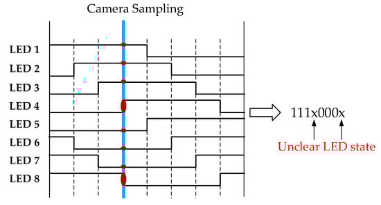 However, there is still a probability that the Rx camera may capture an unclear state of an LED waveform, which is called bad sampling. Figure 5 illustrates the bad sampling issue which occurs when the Rx camera captures at a transition time of an LED. In [], we denote these unclear states as “x” states, which will take a value between zero and one. From that, we can also re-define the S_Phase value for all bad-sampling cases corresponding to each dimming level, as described in Table 3.