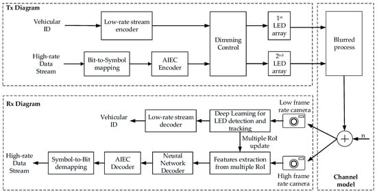 Fortunately, recent developments in deep learning technologies provide us with a new way to approach and deal with this issue. Instead of deriving a complex mathematical algorithm from a pre-defined system model, deep learning, or AI technologies allow the system to learn and approximate an optimizing model directly from training data. Deep learning has proved itself as an efficient tool to deal with various types of problems, including computer vision [], speech recognition [], autonomous vehicles [], and many others. Inspired by these developments, recently many efforts have been made to apply deep learning/AI technologies in communication field (including channel decoding) [,,,,,]. In a vehicular OCC system, the function of the receiver (Rx) mainly includes two tasks: The first is decoding data from the transmitter (Tx), however, to achieve this, it should be able to detect and set up a communication link with the transmitter LED array among thousands of possible artificial lights within an acceptable duration. The second is decoding data from the LED image. The performances of these two tasks could be enhanced significantly by deep learning/AI technologies.