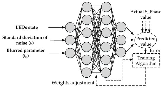 A vehicular OWC/OCC system using a hybrid waveform that consists of low-rate and high-rate data streams can mitigate the computational load on the receiver and thus reduce the processing time. The hybrid spatial phase-shift keying (HS-PSK) single carrier is such a hybrid waveform (see [] and []). HS-PSK is a dedicated combination of spatial 2-phase shift keying (S2-PSK) and dimmable spatial multiple-PSK (DSM-PSK). The S2-PSK data stream is generated based on the changes between the low and high dimming levels of the DS8-PSK waveform, as illustrated in Appendix 2 of []. S2-PSK had been fully demonstrated with implementation results in []. In Section 4, we will illustrate DSM-PSK with M = 8 for eight LEDs in each LED array before proceeding further on our proposed decoding method based on an NN for decoding the high-rate data stream.