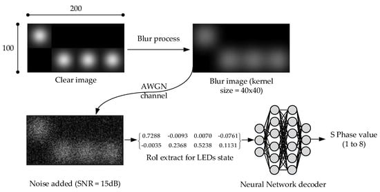 These technical issues lead to the design of an adaptive Rx that could be trained to self-modify its parameters and better reflect the correlation between real-world input data and our desired system output. To be more detailed, AI algorithms could be applied in Rx to enable the following two tasks: Multiple RoIs detection and tracking based on You Only Look Once (YOLO) framework [] and the RoI information from S2-PSK scheme [], enhancing the reliability of decoding data by using NN-based decoder for decoding the bit stream, and AI-based error correction (AIEC) for mitigating the error caused by channel condition []. In this paper, we focus on designing and analyzing the performance of an NN-based decoder to decode data which are contaminated by the blur process and noise.