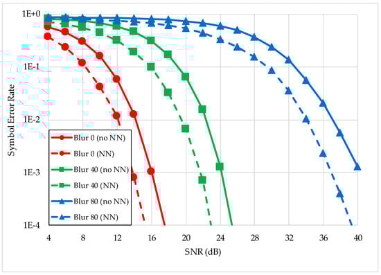 In the non-blur case, to achieve an SER below , the required SNR of our NN decoding must be improved by 2 dB, in contrast to using a matched filter. With a blur kernel size of 40 × 40, the improvement on the SNR of the NN-based decoding is approximately 2.2 dB. However, with a blur kernel size of 80 × 80, our decoder achieved the target SER value at an SNR of 40 dB, and the matched filter achieved an SER of at the same SNR value. Notably, the improvement of the required SNR increases when the blur kernel size is increased (see Figure 9).