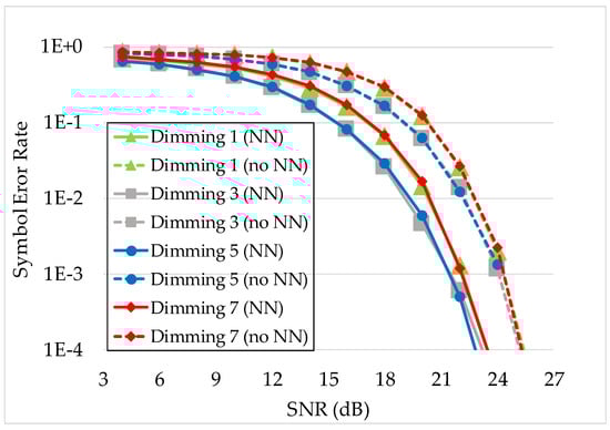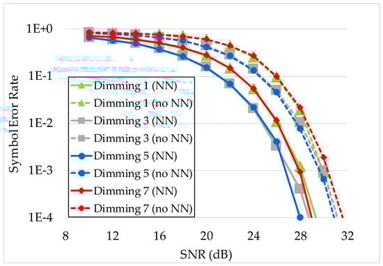 On the other hand, when the blur kernel size exceeds the area of one LED on the image, the blur effect to the central point of each LED is also mixed with a part of other nearby LED illumination area. Thus, the impact of the dimming level could be significant. Figure 13 shows the decoding performance of our NN-based decoder for DS8-PSK, which are evaluated based on the SER value with a blur kernel size of 60 × 60.