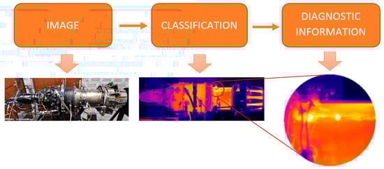 The general concept of the intelligent diagnostic system can be expressed by the scheme shown in Figure 2. The data acquisition part of the approach is usually done using the infrared camera, and the image pre-processing can be done before the data are fed into a classifier. The effects of the image pre-processing and filtering are not directly investigated in this study; however, the methodology is designed to be relatively robust in order to use image data of reasonable quality with low noise levels. Infrared cameras usually pre-process the image data in order to compensate for air humidity and other environmental effects. The robustness is achieved by the application of an intelligent adaptive algorithm, and the design therefore consists mainly of the classifier part by finding a methodology and selecting its structure, input/output relations, and the training algorithm in the case of the application of neural networks. Information about classes in the thermal image can be further used to evaluate the technical state of the investigated object (in this case, a jet engine), and a diagnostic expert system is a natural candidate for the completion of this task. The basis of the proposed methodology is therefore centered around: