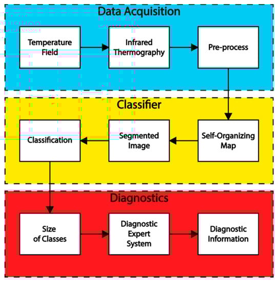 When a human expert inspects infrared images of a technical object, he or she basically performs two operations. First, he/she discriminates different areas of the thermal image and classifies them into categories according to their temperature. They next use their expert knowledge to inspect hot or cold areas for some anomalies according to their position and temperature. The traditional approach is to superimpose the obtained infrared image over a standardized infrared image of an object without defects and evaluate the differences between the two images []. The whole process can therefore be formalized into two basic parts—image processing and classification, and knowledge acquisition. A variety of methods exist to solve both problems, as mentioned in the introduction, and are suitable to identify and evaluate anomalies. As previously stated, one aim of this study was to develop an autonomous diagnostic system which is able to learn and locate anomalies without any prior knowledge (e.g., normal faultless operation IRT images). The other aim was to make the system autonomous.