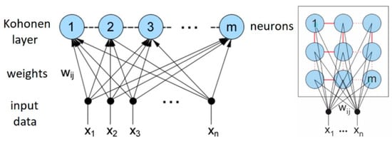 The structure of the network can be visualized as shown in Figure 13. The training parameters which were found to be efficient were set as defined in Table 1, and the standard Kohonen network learning rule was used [,].
