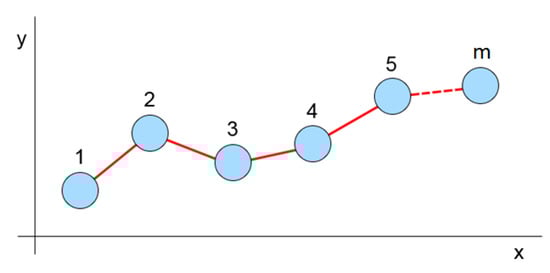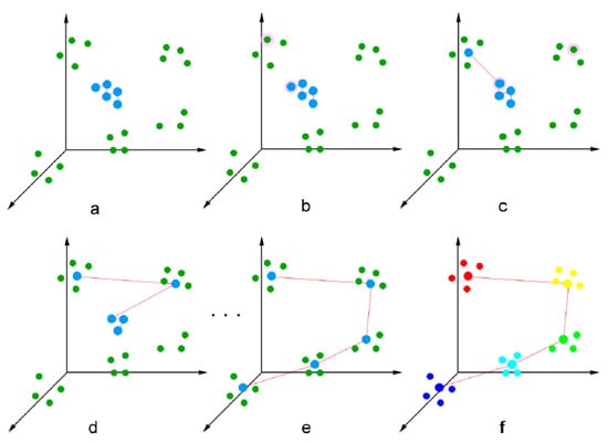 The self-organization process is graphically depicted in Figure 5, where blue dots represent neurons, green dots represent input vectors, and red lines represent connections between neighboring neurons. The temperature field has five areas, which are indicated by five neurons. In this simplistic example, the labeling is performed by coloring the neurons and the corresponding training data, which activates the neurons. In this manner, the blue area after adaptation represents the coldest area in the temperature field and the red area the hottest area.