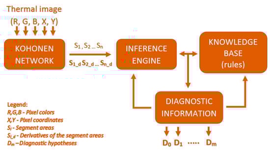 The functionality of this approach has been evaluated and designed specifically for application to turbojet engines, and the approach can be considered as novel compared to other intelligent approaches in turbojet engine diagnostics, which are applied to data measured by the engines’ sensors and do not deal with visual/infrared image information [,,]. The aim of this paper is to explore the design of this new approach and prove its functionality by applying thermal vision-based diagnostics in an automated adaptive system in the area of turbojet engine diagnostics. The approach can be expanded and applied to almost any technical system which has been observed by an infrared camera. The hybrid architecture of our approach, which combines a Kohonen neural network and a specialized expert system with a designed rule-base, can be considered as a novel and original contribution of our research. A proof of concept is presented using real data from an iSTC-21v turbojet engine tested and operated in laboratory conditions.