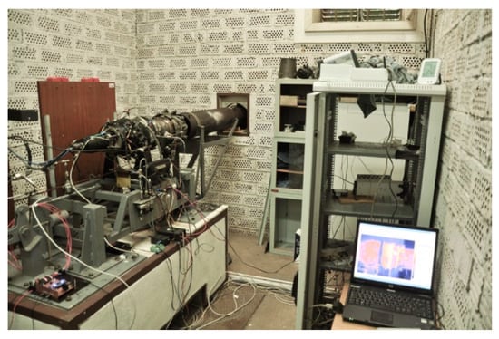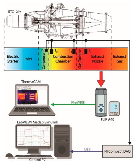 In order to design an infrared imaging-based diagnostic system for use with turbojet engines and to construct a working knowledge base, a small iSTC-21v turbojet engine, developed in the Laboratory of Intelligent Control Systems of Aircraft Engines at the Faculty of Aeronautics, Technical University of Košice (Figure 9), was used []. This is a single-stream, single-shaft turbojet engine with a single-stage one-sided radial compressor, an annular combustion chamber, and a single-stage non-cooled gas turbine with a variable exhaust nozzle with full authority intelligent electronic digital control system developed from the TS-21 engine (Ljulka-Saturn, Rybinsk, Russia). A schematic of the measurement and data acquisition system is shown in Figure 10, and the arrangement of the camera is shown in Figure 11 [].
