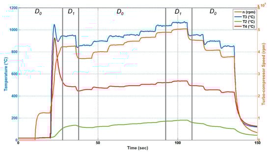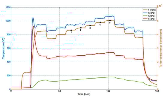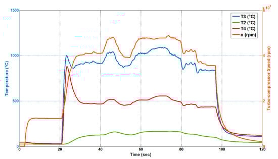 The thermal fields were captured and observed during the whole engine operational process, from its start-up to the time of full thrust, as shown by the measured basic parameters displayed in Figure 12. The infrared camera was positioned 1.5 m from the engine and was turned on 0.5 h before the measurement in order to allow the temperature of its sensor to equalize with that of the environment. Before the measurement, the values of the background air temperature, air humidity, and the emissivity of the engine surface were determined and inputted in the camera. The environment in the laboratory had a relatively stable humidity (around 50%) and temperature (around 21 °C) during the experiments with no direct sunlight. These parameters can have an impact on the precision of the IRT measurements, but can be quite well-controlled in a laboratory environment []. The measured state parameters (n (rpm), T2 (°C), T3 (°C), T4 (°C)) for a single run of the iSTC-21v engine in laboratory conditions are shown in Figure 12.