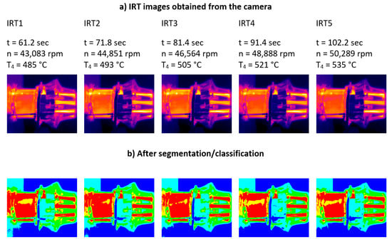 For the diagnostics of aviation engines, IRT is mainly used to check their composite covers []. Another area where IRT is applied, which is closer to the topic of this paper, is the diagnostics of turbojet engines; infrared images of the diagnosed engines’ gas turbines are compared to standard IRT images of engines without defects, which allows temperature field anomalies to be detected and thus allows defects to be identified []. These defects can be damage to the turbine blades, combustion chamber disturbance, disturbance to the homogeneous field of fuel burning, etc. [].