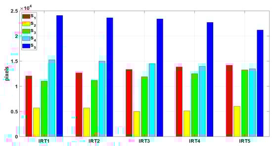 The classifications of the five example images are shown in Figure 15a, and the created segment areas are shown in Figure 15b. Following expert examination of the infrared images and heuristic evaluation of the temperature field, it can be concluded that the Kohonen network works as expected and is able to sensibly assign the hottest and coldest parts of the object to each of the five classes/segments. In order to quantify the results, the number of activations of each neuron are summed, giving the total segment areas S1, …, S5 corresponding to each of the classes N1, …, N5. This can be formalized as follows: