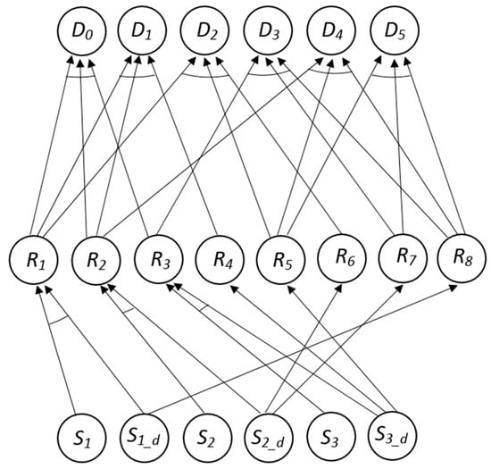 This means that, if the E assumption is true and the rule implies E→H, then the conclusion H is true. In the case of an inference network, the conclusions are represented by facts, which correspond to assumptions of other rules. These inference networks are mostly used in domains where the number of possible solutions is limited (e.g., diagnostic problems or classification problems). The benefit of inference networks is that they can be easily implemented. The following model rules (Equation (4)) [] can be formalized in an inference network structure as shown in Figure 8 []: