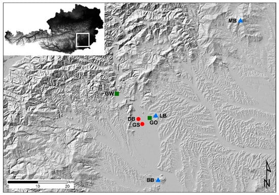Location of the air quality monitoring stations selected for this study as listed in Table 1. Stations of investigation (Graz Don Bosco, DB, and Graz Süd, GS) are marked by red dots. Potential background stations, mandatory for the determination of the net dust load as proposed by the European Commission, are marked with blue triangles. Stations were filter samples for validation purposes were taken are marked via green squares.