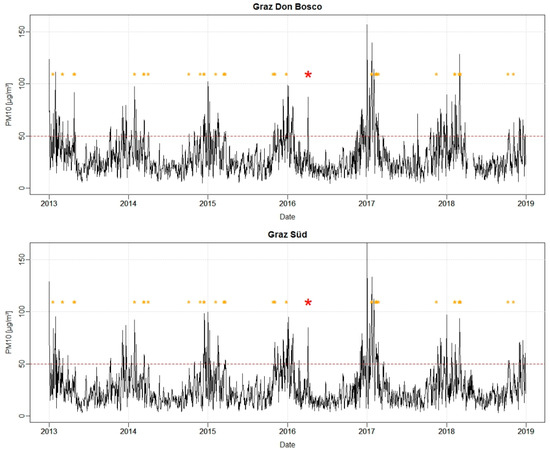 On top of these seasonal variations the influence of long-range transported desert dust may occur. As an example, an intensive desert dust episode in April 2016 is marked by a red star in Figure 2. The identification, intensity and duration of this event, covering large parts of Austria, was already thoroughly described by Baumann-Stanzer et al. [12]. Still a number of less pronounced events took place. Such events, identified via the use of WRF-Chem model forecasts [12], FLEXTRA back-trajectories [25] as well as the dust ensemble forecasts and forecast comparisons provided by the WMO sand and dust storm warning advisory and assessment system (https://sds-was.aemet.es/forecast-products/dust-forecasts), are marked in orange in Figure 2. Additionally optical aerosol properties measured at the high mountain global GAW station Hoher Sonnblick in the Austrian Alps are used for the identification of desert dust (DD) occurrence [14]. The aim of this study was the quantification of DD contributions for days with PM10 exceedances only. An additional influence of desert dust might have occurred during periods of lower PM10 concentrations as well.