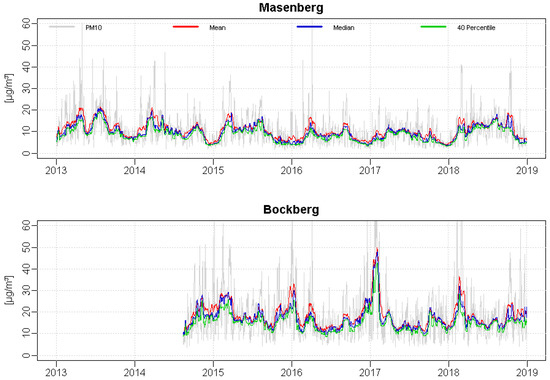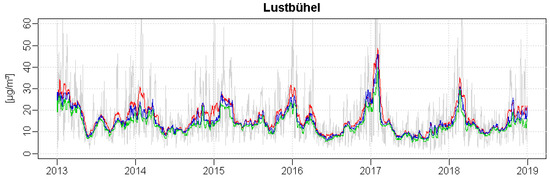 Regarding the quantification phase, we compared the 30-day mean, median and 40th percentile for the computation of the BGL at three potential regional background stations (compare Figure 3). The calculated BGL based on the mean is generally higher than the BGL based on the median or the 40th percentile, regarding all three stations. As may be expected from Equation (1), the estimated NDL decreases as the percentile for the computation of the BGL increases. Again, we decided to stick to a more conservative approach and use the 30-day mean for further computation of the BGL. Using the median or the 40th percentile would reduce the average BGL by 4–11% and 13–21%, respectively, depending on the station used (MB, BB or LB). The BGL calculated based on the 30-day mean varies between 10–50 µg/m3 for BB and LB and between 4–21 µg/m3 for MB and is reduced to 5–45 µg/m3 (BB and LB) and 3–19 µg/m3 (MB) when the 40th percentile criterion is applied.