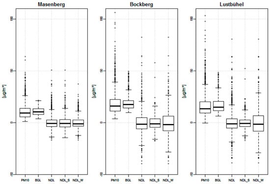 According to Equation (1) the NDLs of the respective days, calculated as the difference between PM10 and BGL, will vary around zero. Negative values represent days where the BGL is larger than the central PM10 value and vice versa.