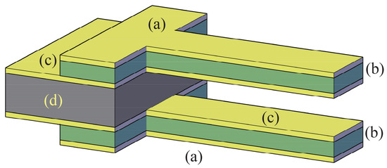 A schematic view of the microsystem: outer layers with a same voltage (a); structural material for the beams (b); internal layers with voltage (c) and structural layer for the handle (d).