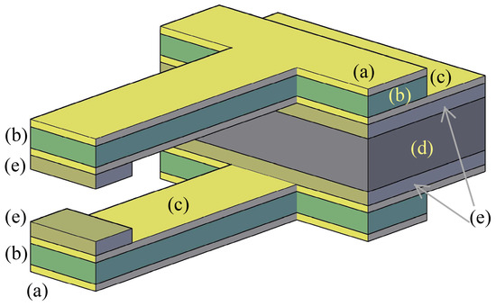 Another possible layout is represented in Figure 2, where two new layers (e) have been added with respect to the previous example of fabrication. Layers (a), (b), (c), and (d) have the same function as described for the previous layout. The second design is better for the operational aspects because a clamping tooth has been added for each jaw. However, these two teeth are more difficult to obtain during the process because they require at least two more deposition layers (e) and also a more complex series of intermediate etching-deposition steps that depend on the selected materials.