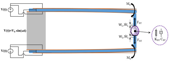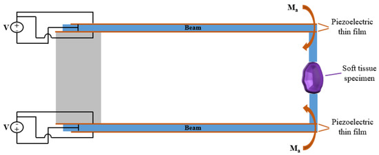 The value of the stiffness and of the equivalent Young’s modulus can be established by a static test with a constant voltage applied to the piezoelectric plates: . In this case, the bending of the beams will cause the compression of the soft tissue and consequently a reaction force will be applied from the soft tissue to the beams, through the clamp teeth (see Figure 5).