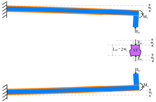 Concerning the piezoelectric actions, many studies [63,80,81,82] have confirmed that, under certain assumptions (piezoelectric plates are perfectly bonded to the structure, the ratio between their thickness and the thickness of the beam is very low and their inertia and mass negligible with respect to those of the beam) the stresses applied to the beam can be considered as they were concentrated at the piezoelectric plate ends. Moreover, if the electric field to the upper plate is opposite in sign to the one applied to the lower plate, such action is equivalent to a flexural moment (see Figure 3) applied to the end of the beam of magnitude equal to: