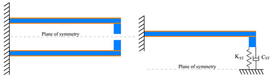 In this work, the FEM results have been chosen as the reference values. Three typical soft tissues (liver, muscle and uterus) of known characteristics [83], have been considered. The value of the beam tip displacement, obtained by the FEM simulations, has been included in the mathematical model to calculate the equivalent Young’s modulus and the viscous damping coefficient. The ST sample stiffness can be calculated by means of Equation (8). The values of the Young’s modulus and the viscous coefficients reported in the literature have been compared with the ones calculated by the new method. Because of the symmetry of the structure with respect to its mid-plane (see Figure 7) only the upper part has been considered in the simulations.