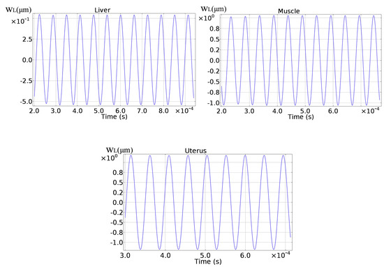 By neglecting the initial transient part, the axial displacements for the various soft tissues have been reported in Figure 8.