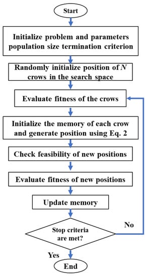 The main advantage of the crow algorithm is that the updating mechanism employs a multidirectional search that advances and improves the diversity of solutions and can lead to avoiding being stuck in a local solution to enhance the possibility of achieving a global solution. This is often a prefect and optimal alternative among the available optimization algorithms in use, especially when dealing with more complex nonlinear and multimodal problems. The crow algorithm has been applied in several fields, such as civil engineering [22,23], medical science [24], and environmental science [25].