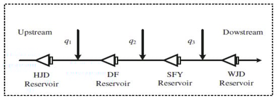 The Wujiang multireservoir system is in the Wujiang Basin, and the Wujiang River is in southwest China. The area of this basin is 87,900 km2, and the precipitation rate for this basin varies from 900 to 1400 mm. This system is one of 13 global systems that produce hydropower, and there are four hydropower reservoirs in this system. The water level reflects the reservoir storage, and thus the variation of outflow is affected by the fluctuation of the water level. When the water level was determined, the storage capacity could be calculated, and hence the outflow (water release) from the reservoir could be computed by continuity and the state equation. Figure 2 shows the multireservoir system where q1, q2, and q3 represent the inflow for each reservoir.