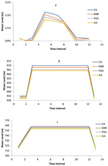 Table 4 shows the 10 random results for the different evolutionary algorithms based on normal years, wet years, and dry years. The average generated hydropower energy for the CA based on normal years was 106.20 (108 kwh), with values of 105.23, 103.98, and 104.22 (108 kwh) via the MBF, GA, and PSO, respectively. The average generated energy for normal years based on the CA was 0.94%, 2.09%, and 1.8% greater than via the MBF, GA, and PSO, respectively. Additionally, the computational time for the CA based on normal years was 24 s, which was 17%, 25%, and 31% less than via the MBF, PSO, and GA, respectively. It can be observed that the results for the dry and wet years assured that the CA could achieve a better value for the objective function with a minimal computational time. The computational time for the CA based on dry years was 23 s, which was 11.5%, 20%, and 28% less than via the MBF, GA, and PSO, respectively. The lowest computation time consumed refers to fast convergence: Also, this reduction occurred when the number of evaluations for the CA was less than other algorithms.