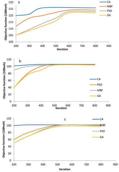 Figure 4 shows the convergence for three years. The results indicate that the CA converged toward more energy produced than other algorithms based on a smaller number of iterations. For example, the CA converged to 106.20 (108 kwh) after 400 iterations during normal years, while the PSO, GA, and MBF converged after 500 iterations. Thus, the CA could achieve an optimal performance goal based on a smaller number of iterations during the optimization process. The parameters for the other methods computed were based on sensitivity analysis, such as CA. For example, the population size for PSO, CA, and MBF was 80, 60, and 30. The mutation probability for the GA was 0.10, and the crossover probability for the GA was 0.5. The inertia coefficient for PSO was 0.8, and the acceleration coefficient for PSO was 2.