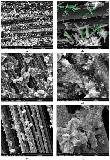 With hydrothermal and spraying techniques to grow nanorods and nanotubes, respectively, the growth is randomly scattered over the carbon fabric, as seen in Figure 1. However, the adhesion to the fabric is ensured by drying the samples for 24 h at 90 °C before making the composite. Tensile tests and fracture analysis performed for various configurations by the authors previously [48] clearly indicated an increase in the interfacial shear strength due to the addition of nanofillers.