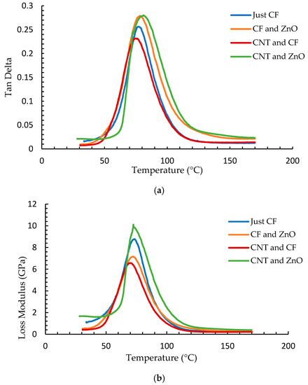 As seen in Table 1, there are significant differences between the Tg values calculated from , vis-a-vis those calculated from the loss modulus peaks. When the tanδ curves were considered, the composite configuration with both CNTs and ZnO achieved the highest value for Tg at 82 °C. A similar trend was not observed from the loss modulus curves. The configuration with raw carbon fibers is seen to have the highest value of Tg at 73.3 °C.