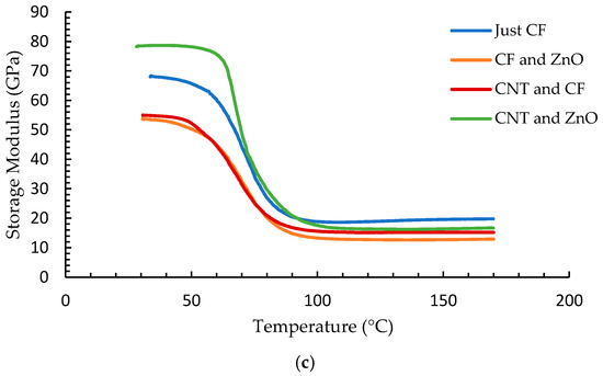 In the presence of ZnO and CNTs, both loss and storage moduli show a significant improvement of 16% and 26%, respectively, as shown in Table 2. These trends are shown in Figure 2b,c. This implies that the composite exhibits improvement in both viscous and elastic properties. This trend was not observed for composites comprising individual fillers where they exhibited considerable drop in both moduli. This can be attributed to the diminishing space for molecular movements due to the high density of nanofillers in the sample that has both nanofillers. The composites with individual fillers demand a uniform distribution of nanorods or nanotubes to show improvement in this aspect. The values for comparison of storage modulus from Figure 2c are taken at 60 °C (below the glass transition temperature). As the storage moduli curve transitions from glassy state to the rubbery plateau state, the differences in values for various configurations become negligible.