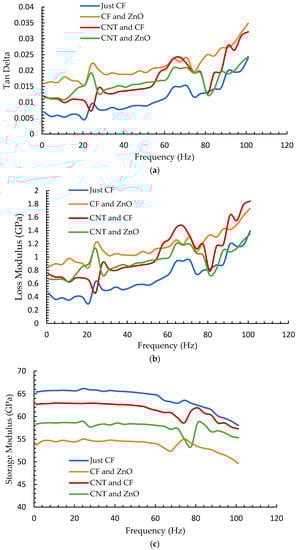As seen in Figure 4c, the storage modulus values tend to increase with frequency. At 100 Hz, the values are much higher than those at lower frequencies. Also, significant noise was observed in the data after passing the corresponding glass transition temperature at this frequency. However, these trends hold for this configuration, where just CNTs are embedded as nanofillers. For other configurations, though the Tg increases with frequencies, fluctuations were noticed in the peaks of tan delta and loss modulus curves. The storage modulus values after the rubbery plateau, which is around 100 °C, are largely independent of temperature and frequency changes. The slight shift of the storage modulus curves to the left as the frequency increases indicates that the glass transition depends on the frequency, as reported before [53]. Glassy to rubbery transitions shift to higher temperatures at higher frequencies. The shift to higher temperatures is a direct consequence of time–temperature equivalence. As the frequency is increased, the time allowed for molecular motion is decreased, increasing the possibility of shorter timescale motions. Hence, the polymer responds more as if it were at a lower temperature than a sample run at a lower frequency but the same temperature. Consequently, higher temperatures are required for a sample to achieve an equivalent mechanical state at higher frequencies, and the transitions shift to higher temperatures.