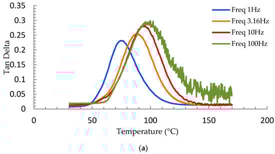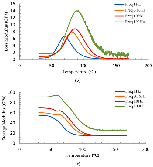 For the calculation of activation energy, Tg values at different frequencies are necessary. In general, as the frequency increases, Tg increases. This trend is signified by the right-biased shift of the plots in Figure 4a,b. The shifts in Tg range from 16–28 °C when the frequency is varied between 1 Hz to100 Hz, as seen in Figure 4a. The value of peak also slightly increases at higher frequencies. Similarly, Tg differences ranging from 10–20 °C are noted in loss modulus curves shown in Figure 4b. The peak values of loss modulus also slightly increase with an increase in frequency.