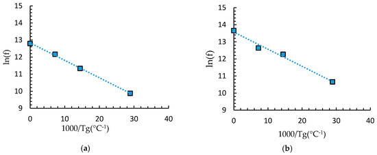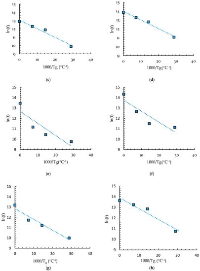 From the analysis discussed in Section 3, the slope of ln(f) vs. 1/Tg curve gives the value of . The Tg values were obtained by the peaks of the loss modulus and the peaks of the tan delta curves at different frequencies for each configuration. From the variation of the Tg from the storage modulus or tan delta curves as a function of the frequency, transition maps can be compiled using Equation (5). Since the locus of the transition maps are straight lines, as seen in Figure 5, an activation energy for the phenomena responsible for the viscoelastic behavior can be estimated.