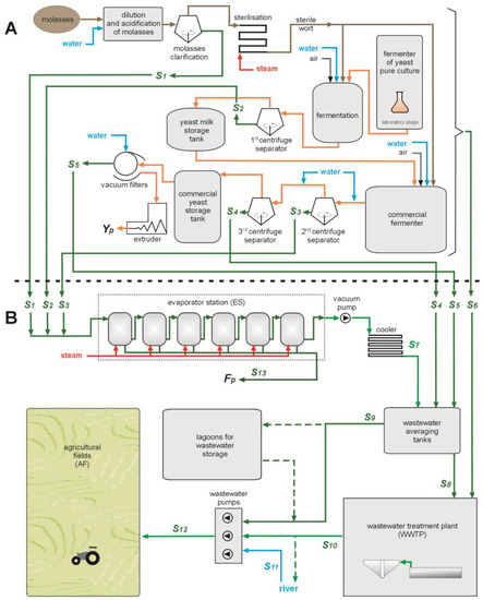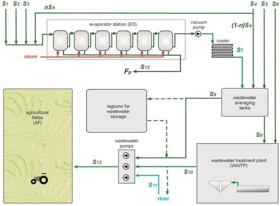 The food industry forms an important sector of the European economy [1]. It is involved in processes related to the increase in gross domestic product as well as satisfying domestic demand. It also contributes to the creation of new jobs and plays an important role in the international trade exchange. Consequently, we can state that the role and relevance of the food industry are huge. However, the production potential of the food industry and its capabilities are influenced by the potential held in the natural resources and technical measures that are accessible in a given country. These factors, directly or indirectly, affect the production of food products. However, when the importance of the food industry in the national economy and individual countries of the European Union is investigated, the impact of agriculture on the natural environment should be particularly taken into account. Measures aimed at reducing the negative impact of human activity on the environment are increasingly being taken into account in production [1,2]. In accordance with the idea of sustainable development, the rational use of natural resources will meet the needs of the present and future generations. In addition, the measures applied to limit the generation of large amounts of waste or process wastewater can, consequently, contribute to a smaller financial burden for enterprises associated with their disposal [2]. In recent years, the Polish food sector has undergone tremendous changes, both in terms of technology and measures linked to environmental protection. Thanks to the constant technical, engineering, and innovative development, Poland has become one of the leading food producers in Europe. One of the factories belonging to the group of European leaders, in terms of the variety of products on offer, is provided by the yeast factory analyzed in this paper [3,4]. The yeast industry consumes significant amounts of water for the production of yeast and, consequently, huge amounts of process wastewater (technological wastewater) are produced, which need to be later utilized. Process wastewater from the yeast industry mainly originates from decanting and wort thickening. This wastewater is of plant origin and due to the high content of nitrogen, potassium, and organic substances, it can be (and often is) deposited on agricultural fields (AF) to play the role of a fertilizer. Chemical analysis of the level of humus in soils, in which process wastewater from the yeast plant is deposited, does not demonstrate an increase in the accumulation of heavy metals. The values of concentrations of trace elements in soils irrigated with yeast wastes are much lower than the levels that are permitted in soils and plants. The parameters of natural geochemical values in soils are, thus, not exceeded [5]. Research has also been carried out into the treatment of yeast wastewater by application of nano-filtration, electro-coagulation, or in the use of technological yeast wastes for application in the direct generation of electricity using microbial fuel cells [6,7,8,9,10,11,12]. The deposition of process wastewater derived from the yeast industry on agricultural fields (AF) seems to represent the most rational solution [5,13,14]. Cultivation on AF fertilized with yeast technological wastewater is characterized by a considerable efficiency. In addition, such wastewater contains organic substances that have a positive effect on the fertilized soils and contributes to the improvement of soil quality in the vicinity of the plant [15]. However, it is possible to irrigate AF using only limited amounts of process wastewater [15,16]. The main reason that the volume of wastewater directed to AF needs to be limited is associated with the concentration of nitrogen in this wastewater [15,17]. For this reason, wastewater is often pre-treated in an evaporator station (ES), in order to decrease the nitrogen concentration in wastewater that is applied to AF. Theoretically, when a larger amount of wastewater is routed to process in an ES, the possibility of using larger amounts of process wastewater in AF is feasible, which, in turn, can lead to an increase in the yeast output [18]. Previous studies [18,19] have shown the necessity of a detailed analysis of the wastewater treatment system in yeast factories. The analyzed factory includes a three-stage wastewater treatment system, comprised of an agricultural field (AF), an evaporator station (ES), and a biological wastewater treatment plant (WWTP). The analysis of the three-stage wastewater treatment system (AF–ES–WWTP) in a yeast factory will provide the development of a solution leading to an increase in production, without the plant exerting additional pressure on the natural environment. A detailed analysis of technological wastewater streams will determine the level in which the production of yeasts (and fertilizers forming a by-product) can be increased in the ES. The use of the ES is essential, in order to reduce the concentration of nitrogen in process wastewater and the possibility of increasing the amount of their deposition on AF, in particular in the case of large-scale production.