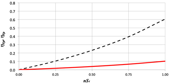 The increase in yeast production ηYp and fertilizer production ηFp versus the volume fraction n (the part of stream S4 directed to the ES). The dotted line represents the theoretical increase, and the red line is the real increase possible to achieve, considering the data from the analyzed factory (at current efficiency of the ES).