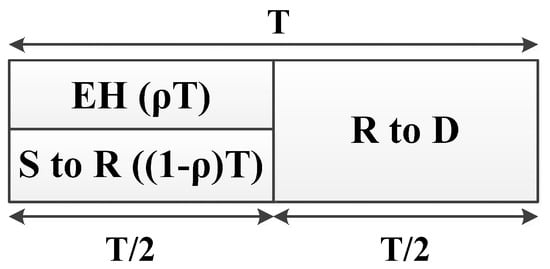 An HD EH relay network over the different fading environment (Rayleigh and Rician Fading Channel), with the effect of HI, is illustrated in Figure 1. This system model is working in AF mode and PS protocol, in which the source (S) and destination (D) can exchange their signal via the helping Relay (R), as shown in Figure 1. The PS protocol of the system model is plotted in Figure 2. Here, T denotes the block time for EH and IT processes in the PS protocol. In the first half interval time T/2, the S simultaneously transfers information and energy to the R with the PS factor ρ ∈ (0, 1), ρ P is used for energy harvesting at the R and (1 − ρ) P is used for transmitting information to the R node. So, the remaining T/2 interval time is used for transferring information from the R to the D [,,,].