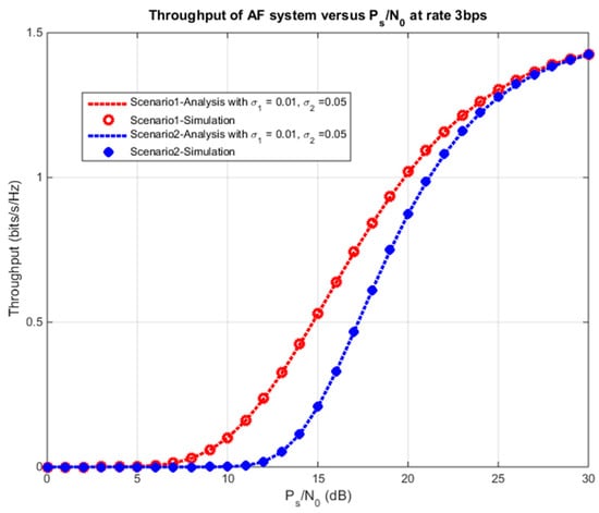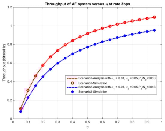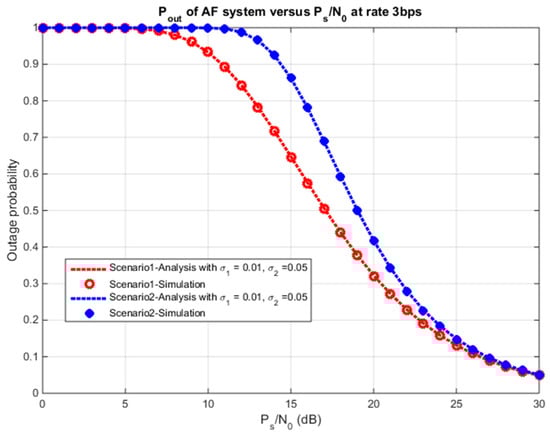 Figure 3 and Figure 4 plot the OP and AT versus the energy conversion efficiency η. The effect of η was investigated in both scenarios, and we vary η continuously from 0 to 1. From the figures, we can see that the OP decreased and the AT increased crucially with η varying from 0 to 1; and the OP and AT in the second case is better than in the first case. Furthermore, the results show the correctness of the simulation and analytical expressions. Moreover, Figure 5 and Figure 6 plot the impact of the ratio Ps/N0 on the OP and AT, while the ratio Ps/N0 increases from 0 to 30 dB. From the research results, we can state that the OP decreased and AT increased with the rising of the ratio Ps/N0, and the analytical results match very well with the analytical values.