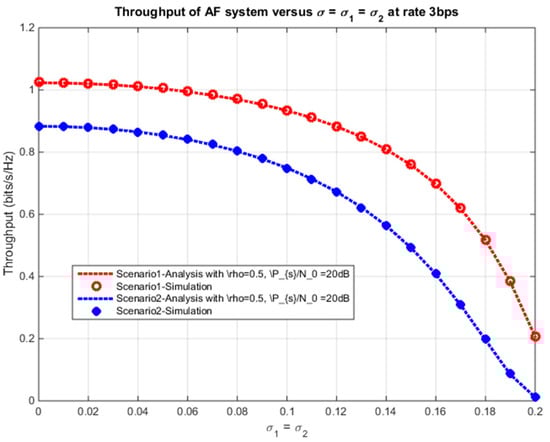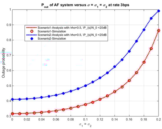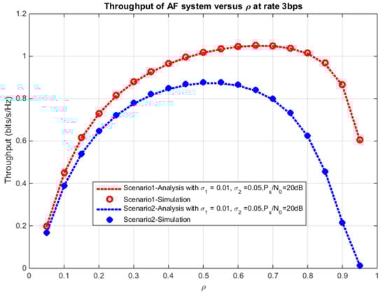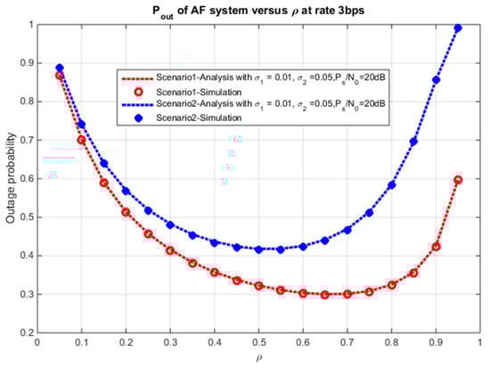 In addition, the OP and AT versus the PS factor ρ are shown in Figure 7 and Figure 8. It can be observed that the AT increased and OP fell at the D with factor ρ from 0 to 0.6. After that, the OP and AT had the opposite effect when ratio ρ from 0.6 to 1.0. We can find the optimal value of factor ρ from 0.6 to 0.7 in this situation. It can be observed that when ρ is too small, R cannot harvest enough energy from S to operate reliably, but when ρ is too large then the reliability of the communications link from S to R is impaired. Furthermore, the OP and AT of the model system versus σ1 = σ2 varied from 0 to 0.2 and are plotted in Figure 9 and Figure 10. In the same way, OP increased and AT decreased with the increasing of σ1 = σ2. In all the above figures, the simulation and analytical results agree well with each other.