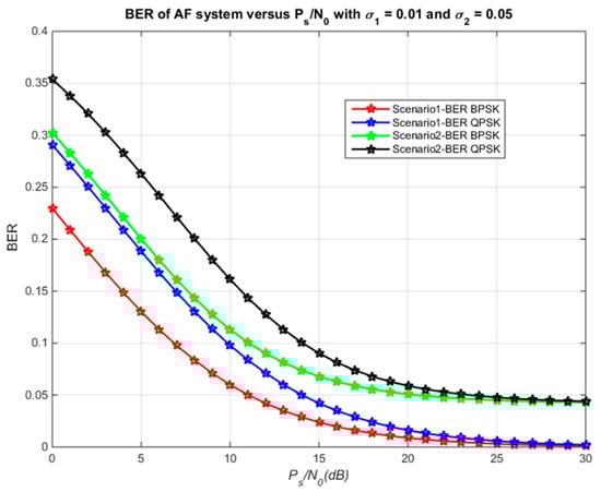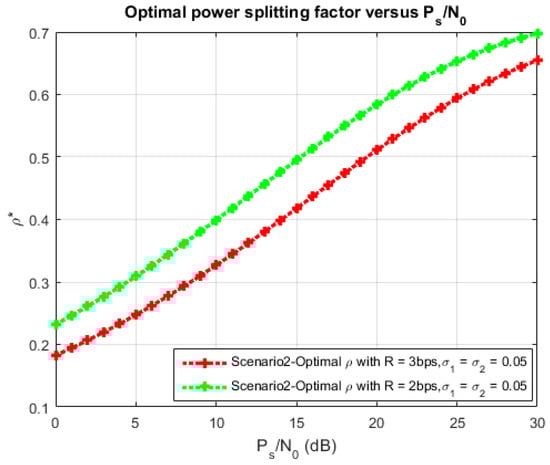 Figure 11 and Figure 12 show the optimal PS factor versus the ratio Ps/N0 in both scenarios. As shown in the figures, the optimal power splitting factor increased while the ratio Ps/N0 varied from 0 to 30 dB. Moreover, Figure 13 plots the dependent of BER on the ratio Ps/N0. The results show that BER decreased significantly with Ps/N0 from 0 to 20 dB. After that, BER slightly decreased.