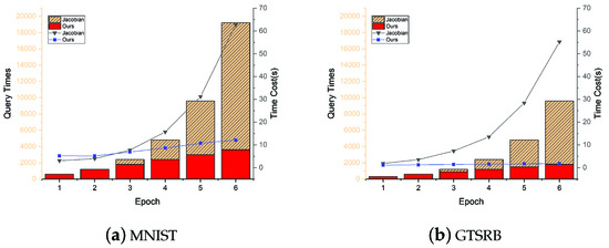The first effect we want to know is the decrease in query times. In addition, as the process of our method, we only augment the initial image set in each substitute training epoch, so that the increasing number of query times is just the same as the number of initial images. In other words, the query time increases with the substitute training epoch linearly. Moreover, speed is another piece of information that we want to compare with the Jacobian-based augmentation method.
