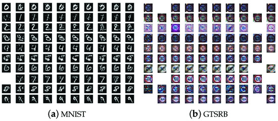 23] datasets to generate our experiments. MNIST is a well-known grayscale handwritten digits dataset that contains 60,000 training images and 10,000 test images of 10 classes, and in the experiments we also keep its scale as 28 × 28. Another dataset is the German Traffic Sign Recognition Benchmark, which contains 43 classes of 39,209 training and 12,630 test images. Unlike the MNIST dataset that only has only channel, GTSRB is a colorful dataset with R(red),G(green) and B(blue) channels. In the experiment we rescale all images of GTSRB into 48 × 48. All of the image pixels are preprocessing to range (−0.5, 0.5) [